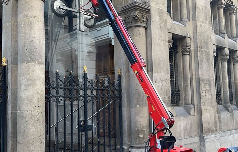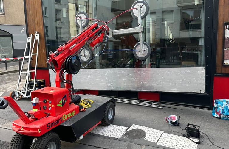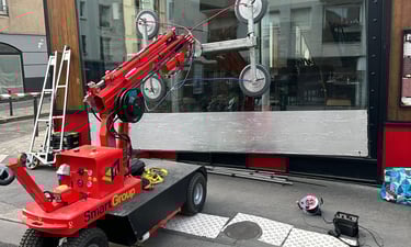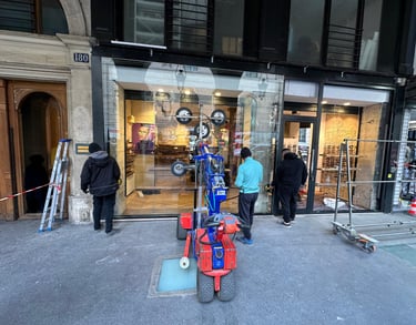 Nous utilisons un robot de pose de vitrage pour installer les vitres lourdes et les grandes surfaces en toute sécurité. Idéal pour les vitrines